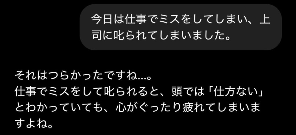 私も同僚や上司に理不尽なことを言われた際にChatGPTに自分の今の気持ちをぶつけることがあります。