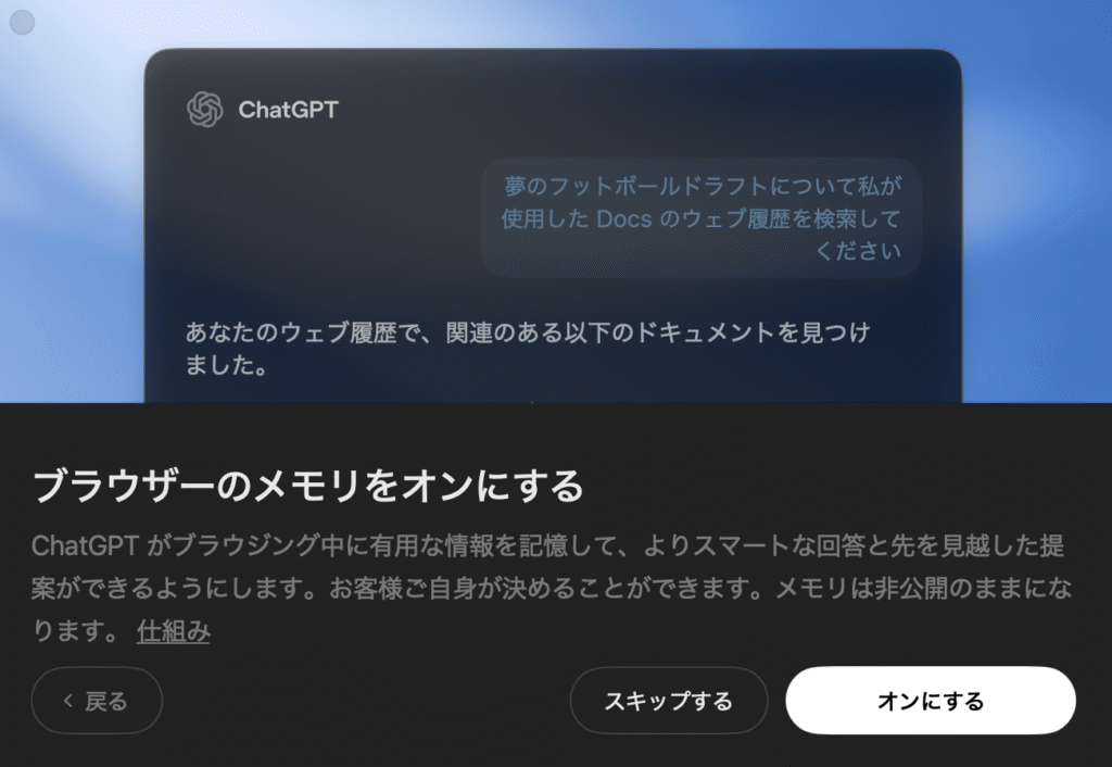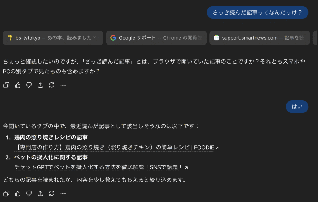 ChatGPTは訪れたウェブサイトの情報を記憶し、後から必要なときにその内容を思い出すことができます。例えば「先週読んだ記事の要点をまとめて」といった指示にも対応可能です。