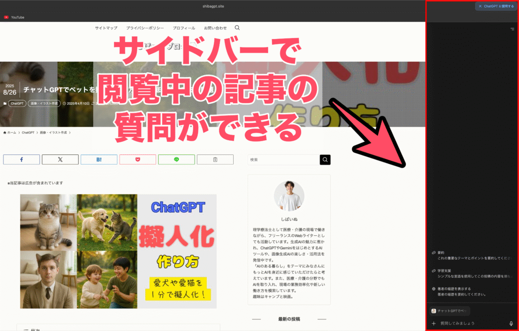 今見ているWebページについて、別のタブを開いたりコピペしたりせずに、その場でChatGPTに質問できる仕組みです。