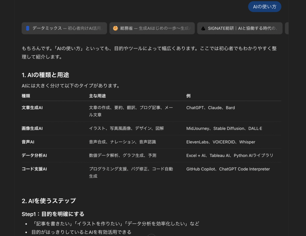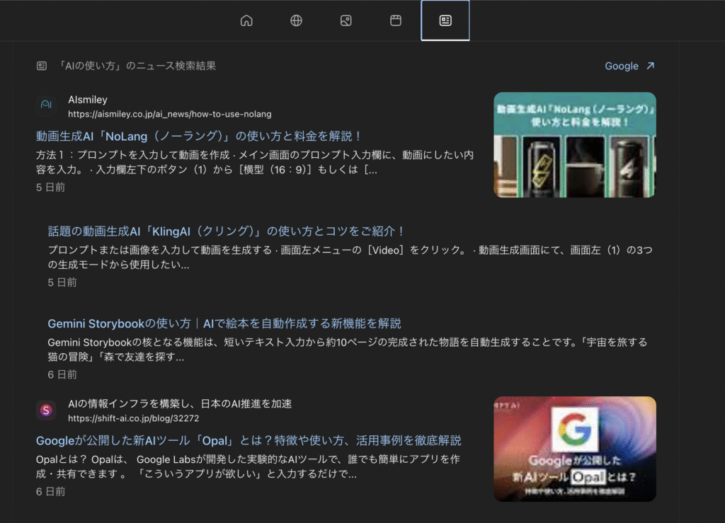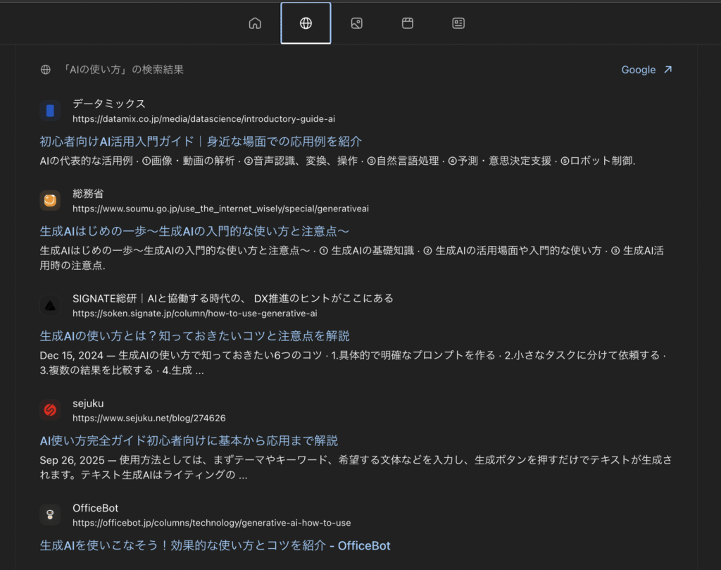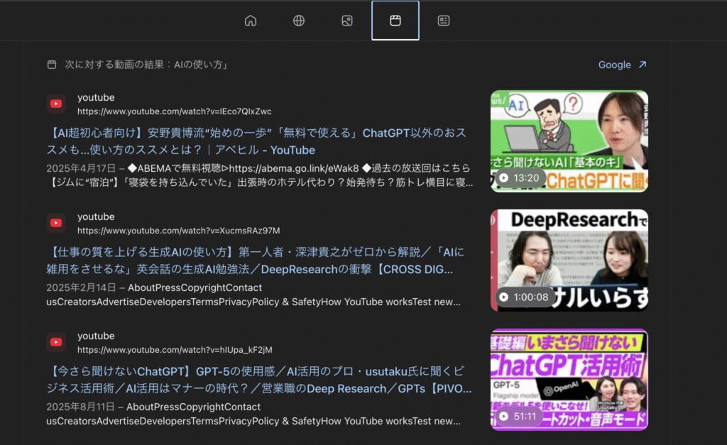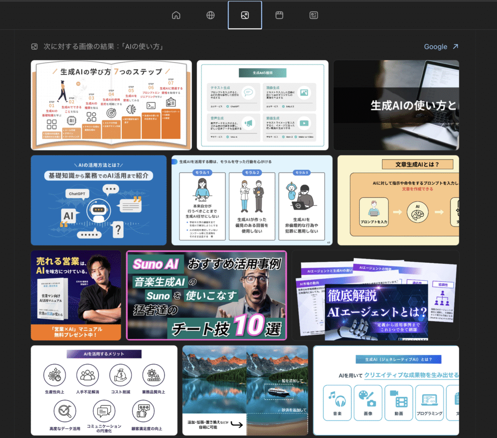 1度の検索でAI、ウェブ、画像、動画など多様な検索結果が表示されるので効率的に情報を得ることができますね!