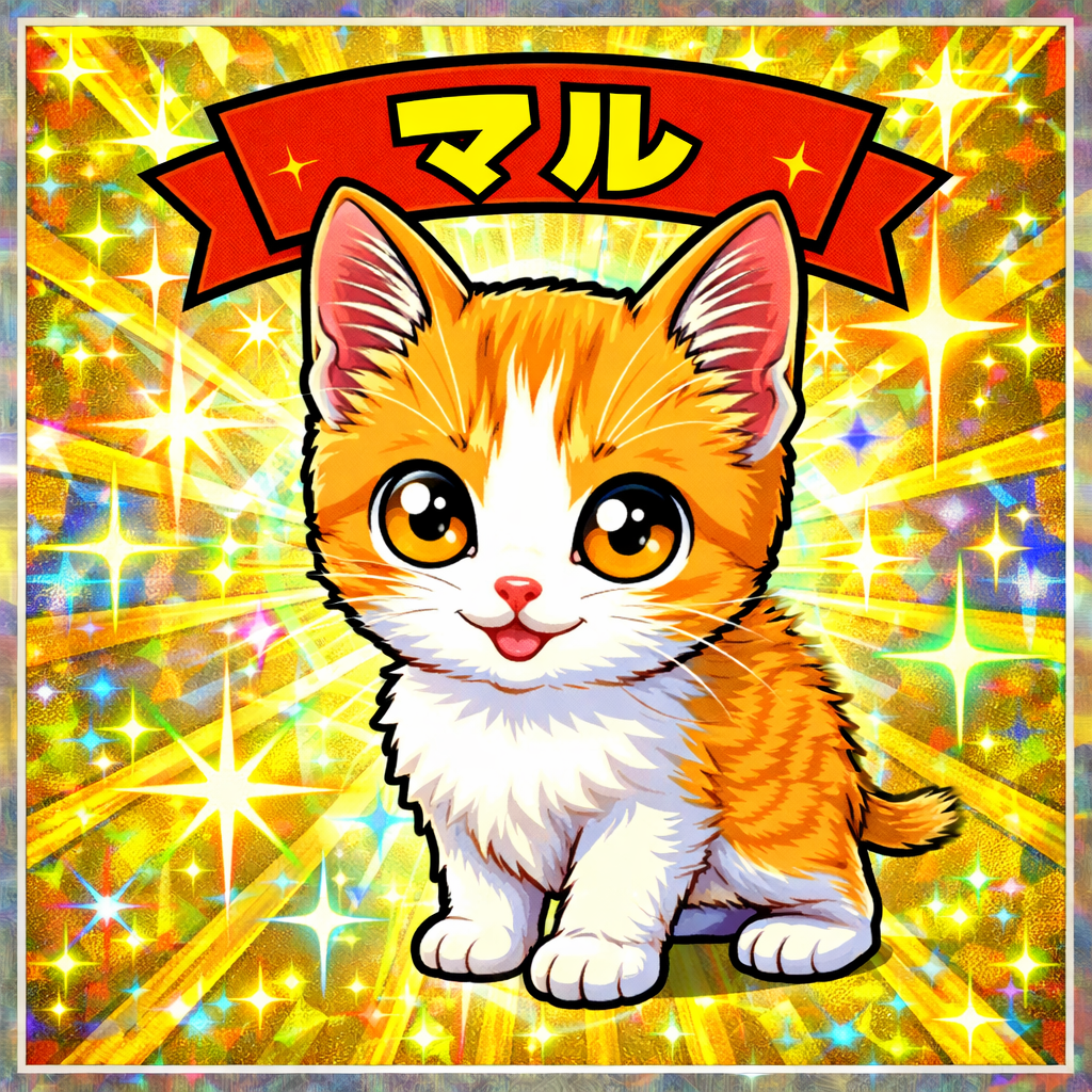 デフォルメされた日本のアニメ風キャラクター、ビックリマンシール風のイラスト表現。 頭身は低く、頭が大きく体が小さい。 太くはっきりした黒いアウトライン、原色を多用したポップな配色。 キラキラしたホログラム風の背景、幾何学模様と放射状のエフェクト。 表情は誇張され、目は大きく、眉と口はシンプルで力強い。 90年代日本アニメシール風、レトロ、ポップアート、平面的な塗り。 影は最小限、セル画調。 高解像度、正面構図、シールデザイン。 名前は「 」と入れて。