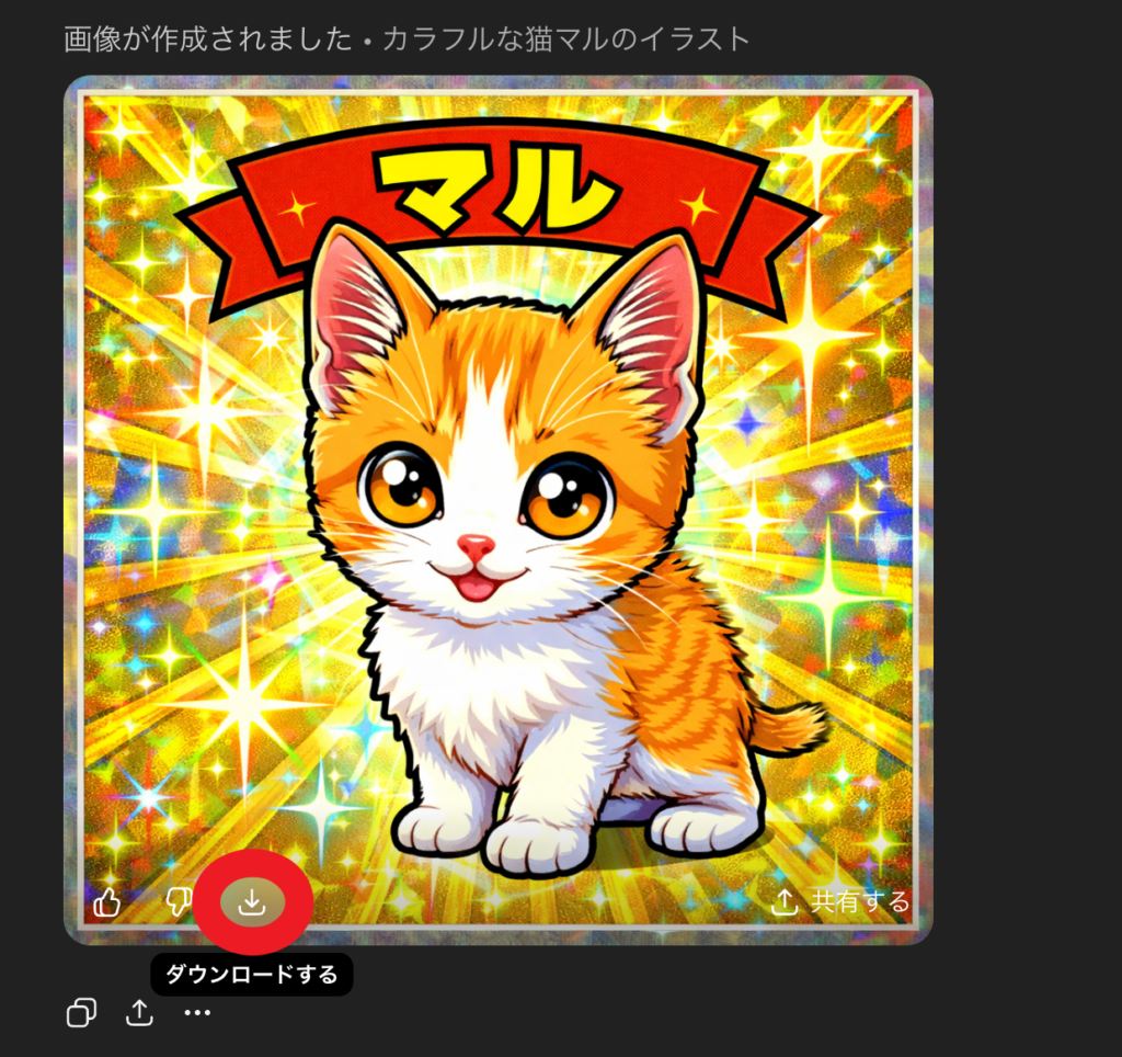 生成された画像の左下にダウンロードマークがありますので、そちらをクリックするとダウロードが開始されます。