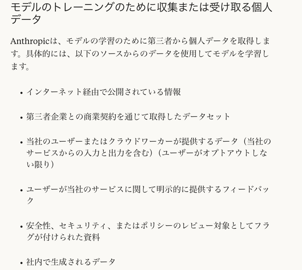 ClaudeのAI学習の方法(Claudeのプライバシーポリシーより引用)