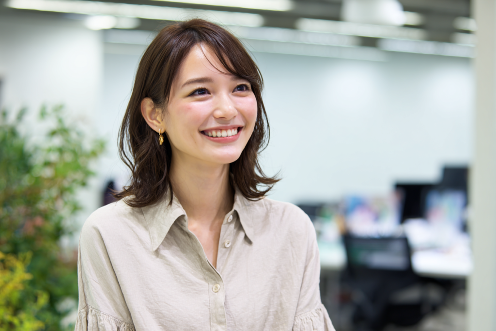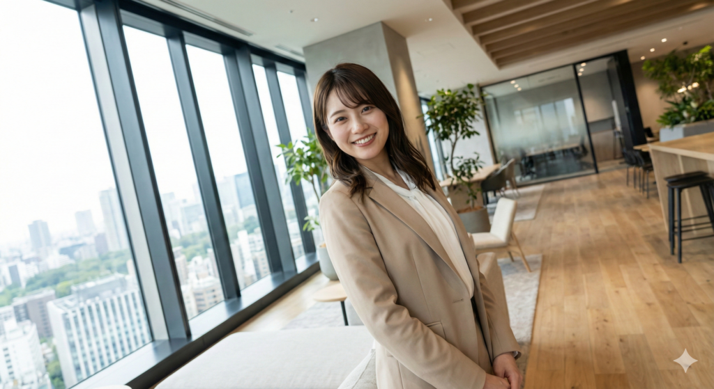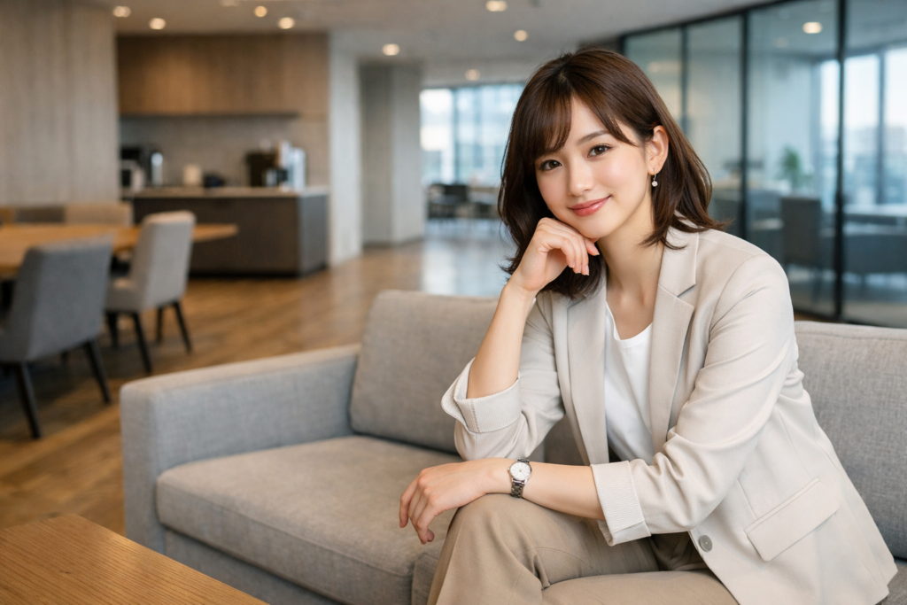 都会的な室内空間で、20代前半の日本人OLが雑誌モデルのような自然なポーズをとるシーン。斜めからの広角構図で、空間の奥行きと人物の立体感を表現。背景はリアルで自然、余計な装飾のない洗練されたインテリア。表情は落ち着きと親しみやすさを併せ持ち、仕事ができそうな印象。高画質、ナチュラルな色味と光の表現を重視。マーケティング、企業サイト、サービス紹介など幅広く使える汎用性の高いビジュアル。