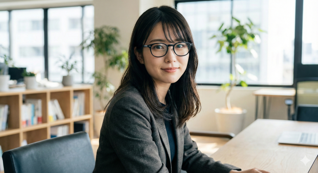 20代前半の日本人女性OL、シンプルなメガネをかけ、雑誌モデルのように美しい姿勢でこちらを見る構図。やや斜めからの広角で、表情と背景の両方を自然に収める。背景はリアルな室内空間で、柔らかい自然光が顔を優しく照らす。知的で落ち着いた雰囲気、親近感と信頼感を両立した表情。高画質で肌・髪・メガネの質感まで丁寧に描写。マーケティング、サービス紹介、ビジネス系コンテンツに適したクリーンな仕上がり。