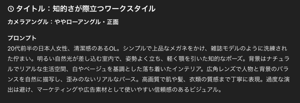 美女 20代前半 OL メガネ 雑誌モデル 広角 高画質 背景も自然でリアル 日本人 マーケティング用 一つのプロンプトは200文字。プロンプトを5個考えて。タイトルをつけて。カメラアングルはランダムにして 雑誌モデルのようなポーズ 日本語のみ 画像は生成しない