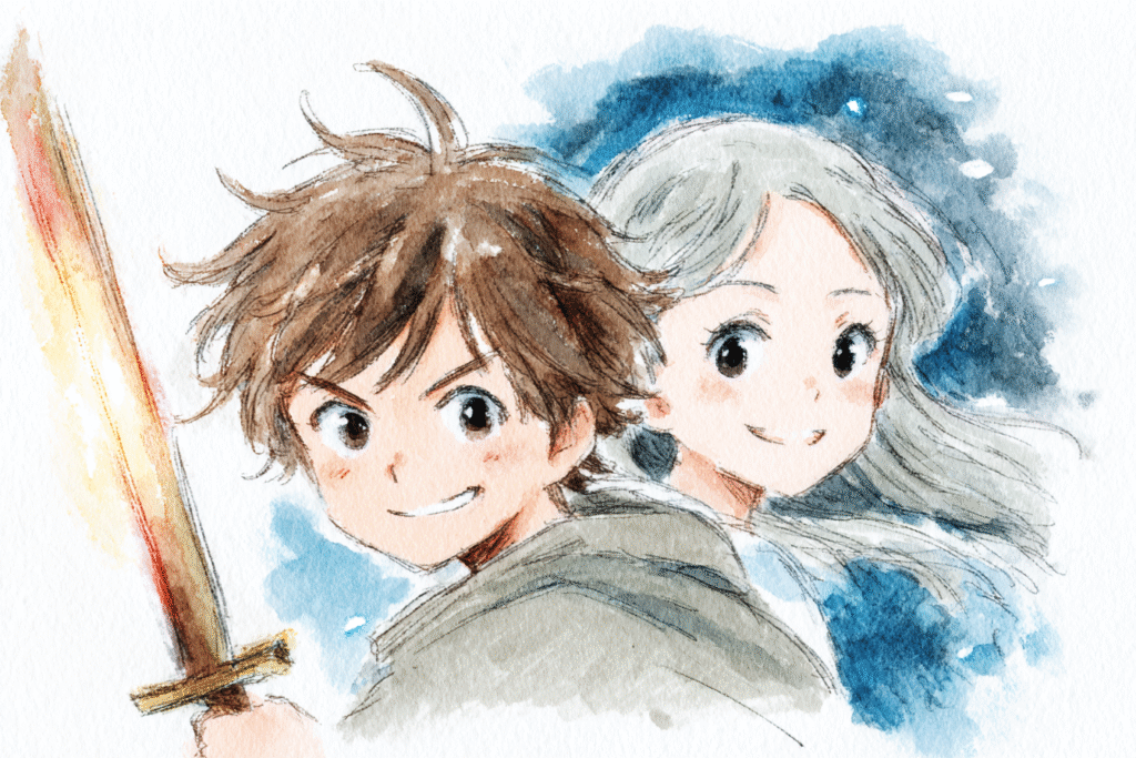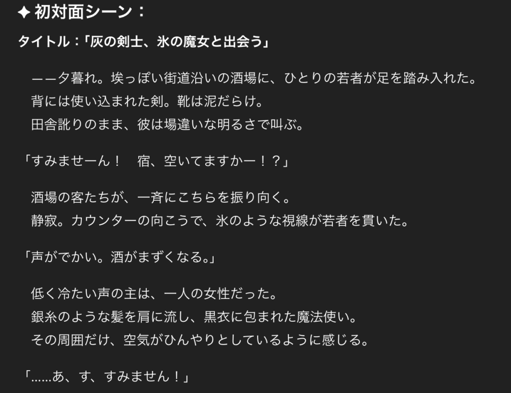 「主人公は農村出身の若き剣士で、どこか抜けている性格です。相棒は魔法使いの年上女性で冷徹です。この二人の初対面シーンを書いてください」と具体的に指示。