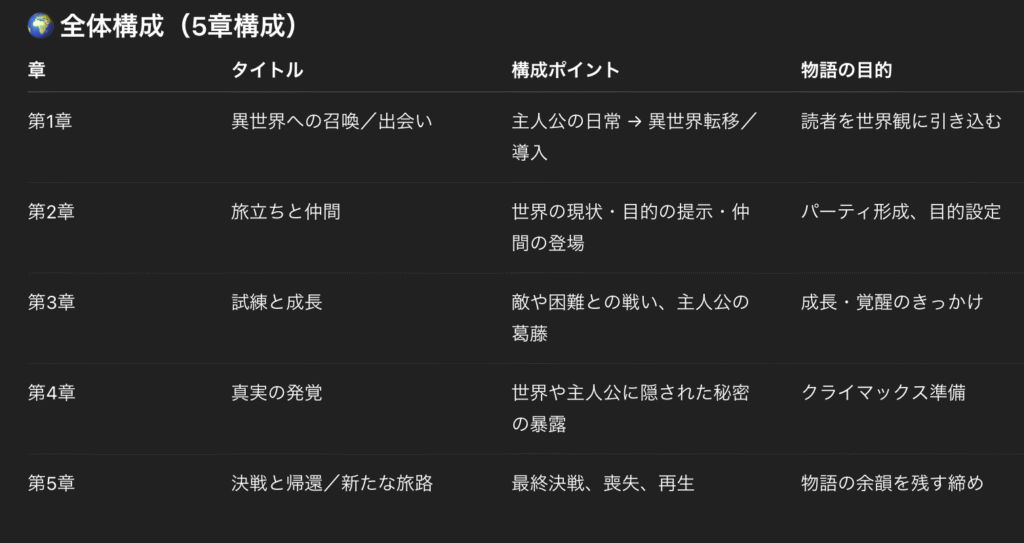 ChatGPTに「異世界ファンタジーの冒険小説の構成を作ってください」と依頼。起承転結の大まかな流れを提案してもらいます。