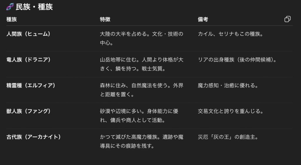 「この物語の舞台となる世界の地理、民族、魔法体系について、簡潔に説明してください」と世界観の詳細を生成してもらいます。