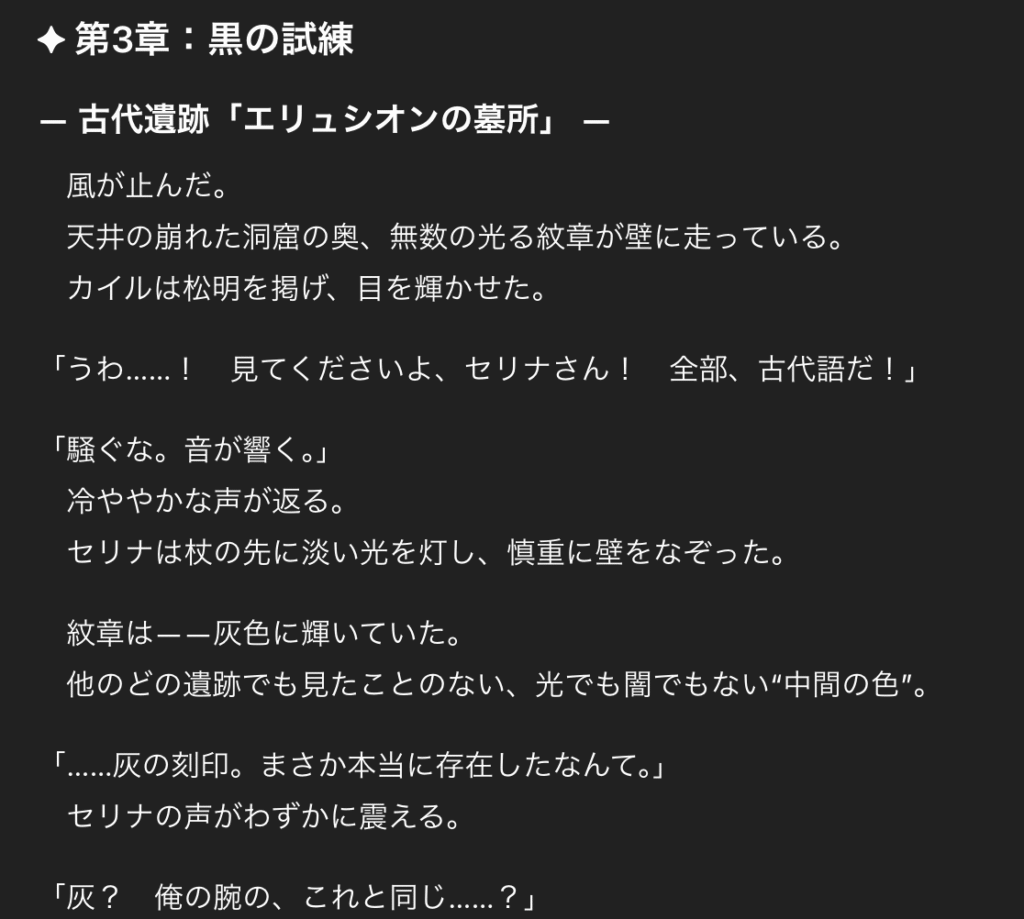各章ごとに「第3章では、主人公たちが古代遺跡で〇〇を発見する場面です。冒険のワクワク感と、伏線を張るような緊張感を含めて書いてください」と部分的に執筆を依頼。