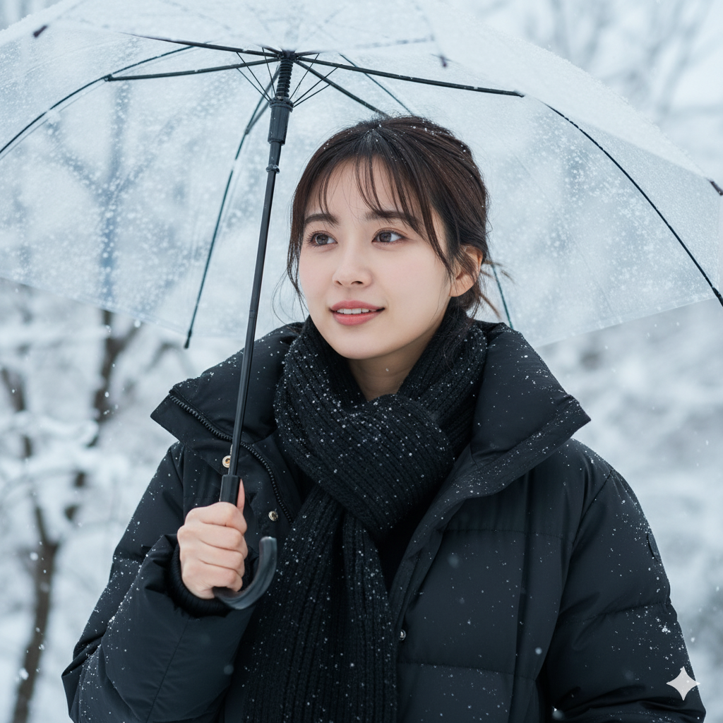 超高精細な人物のポートレート、冬のシーン、黒のダウンジャケット、分厚い黒のニットスカーフ、透明なビニール傘を持っている、ナチュラルメイク、濡れた髪、軽い雪が降っている、非常に詳細な肌の質感。