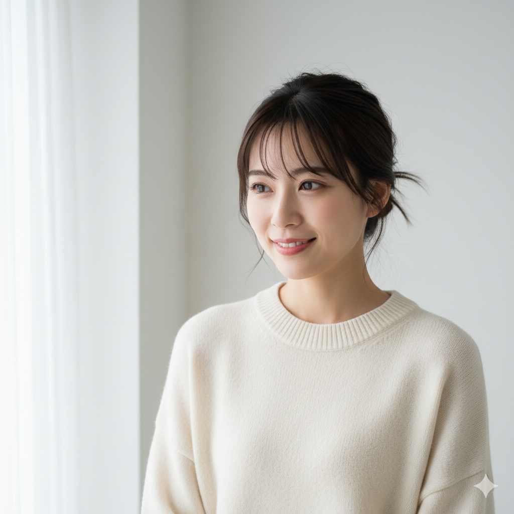 左側:被写体の上半身クローズアップ。厚手の黒いトレンチコートとざっくりとした黒いニットマフラーを着用。軽い積雪があり、雪片が肩やマフラーに散らばっている。憂いを帯びた視線でフレームの右方向を見つめている。