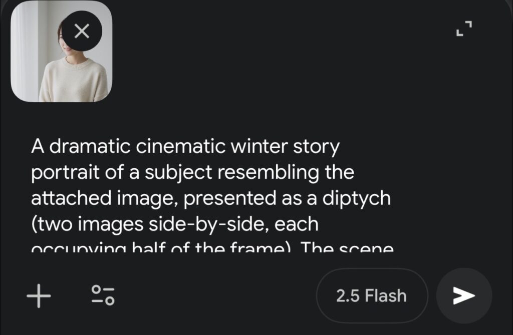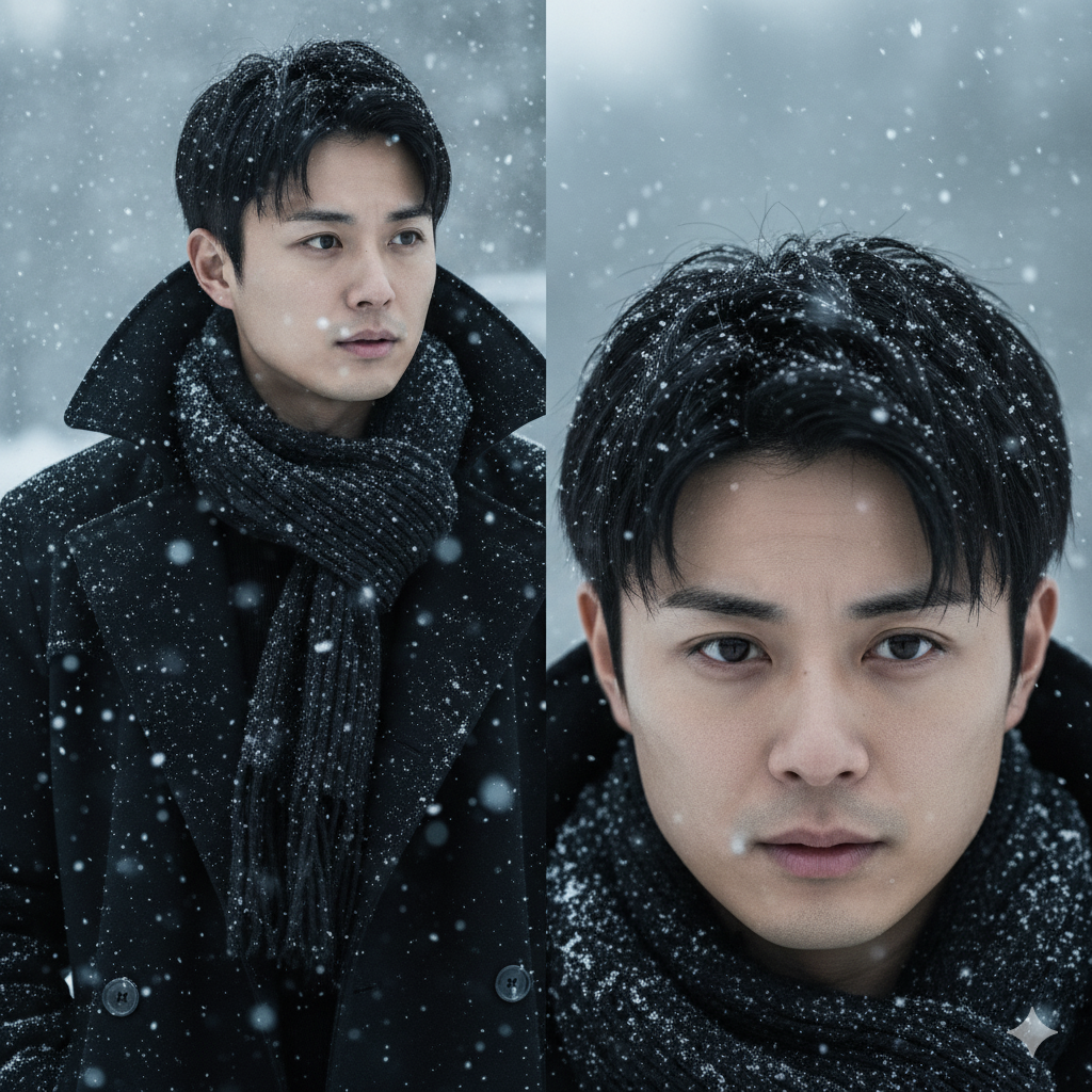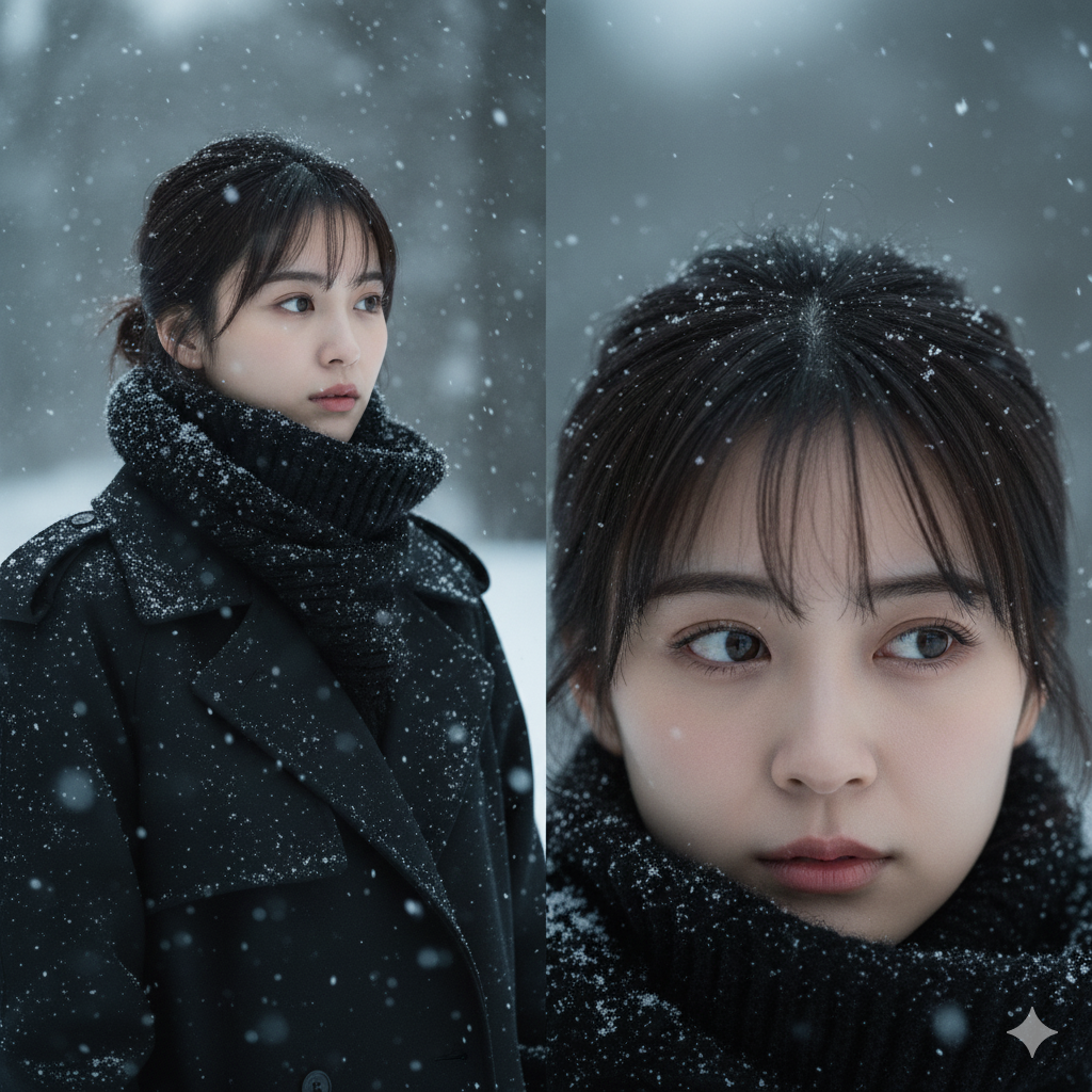 添付画像に似た被写体による、劇的な映画のような冬の物語のポートレート。ディプティック(二連画)形式で提示され(2枚の画像を左右に並べ、それぞれがフレームの半分を占める)、寒々しく、孤独な、大雪の冬景色が特徴。全体はクールなグレーの美学で統一されている。細かな雪が静かに舞い、映画的な質感、柔らかな環境光、浅い被写界深度を効かせる。アスペクト比は3:4。